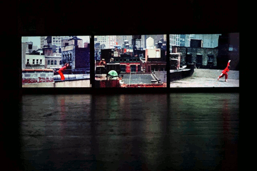 The installation is projecting three films that were shot in 1973 to chronicle the performance. Those 32 minutes