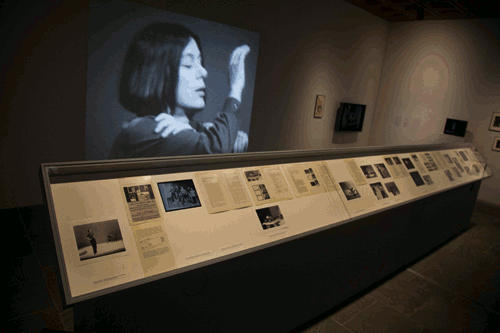 The archival photographs, script pages, and notes displayed in this vitrine, along with the film footage projected or shown on three small monitors inside the vitrine, are a re-presentation of Yvonne Rainer's seminal 1973 performance piece this is the story of a woman who... The original performance featured a man and woman played by Rainer and John Erdman whose inner thoughts about their relationship (visible as text slide projections) contrast with their physical actions while a narrator played by Shirley Soffer appears on-stage and analyzes the ambivalence the man and woman feel for one another. In her script for the performance, Rainer captures the difficulties of genuine communication between two lovers. Filmmaker Babette Mangolte, who shot the performance photographs and films during rehearsal in 1973, selected the script pages, designed the display and added in printed subtitles her own commentary about the original narrative, bringing a 2013 sensibility to material from 1973.