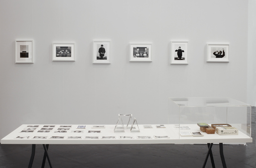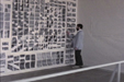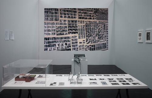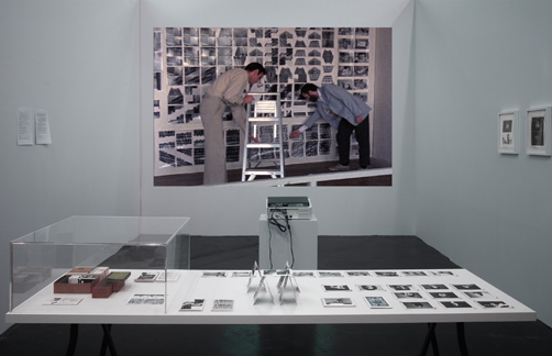 The walls for the installation should be painted very light grey as well as the table and the support for the program notes. The film is projected as a loop on the wall painted with silver paint that increases the brightness of the video projection of the film shot in color about black and white photography. The video projector should be hanged from the ceiling so it is not blocking the view from the table to the screen.