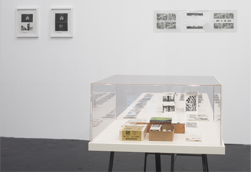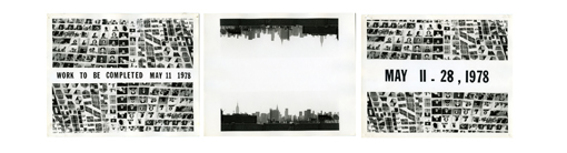 from 1977 made as test for a flyer for The Camera: Je, La Camera: I with Stuart Sherman's portrait and a row of building on Canal Street, New York, placed at right of screen. It is the work on the flyer that led to the subsequent 1978 installation re-imagined here.